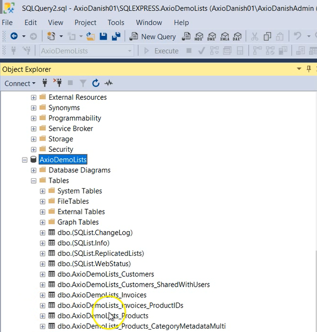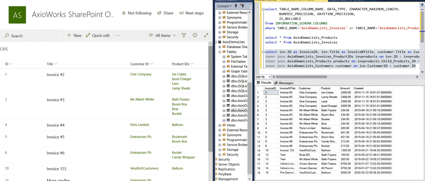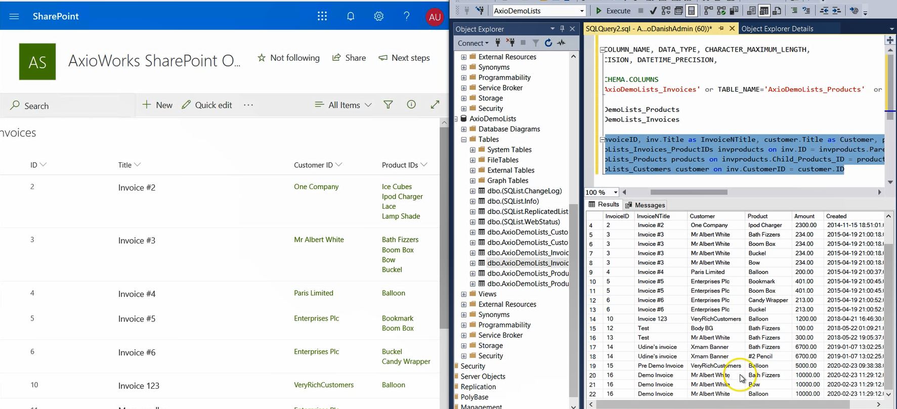 For each lookup column with “Allow multiple values” selected, SQList creates a separate SQL table which stores the ID of the parent list item and the lookup item ID/s creating a one to many relationships between parent and child tables. Since the Invoice list has a lookup column “Product IDs” with allow multiple values checked, a table “AxioDemoLists_Invoices_ProductIDs” is created.