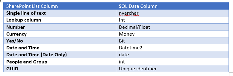 Below is the table to show the conversion of sharepoint list columns into sql data columns.