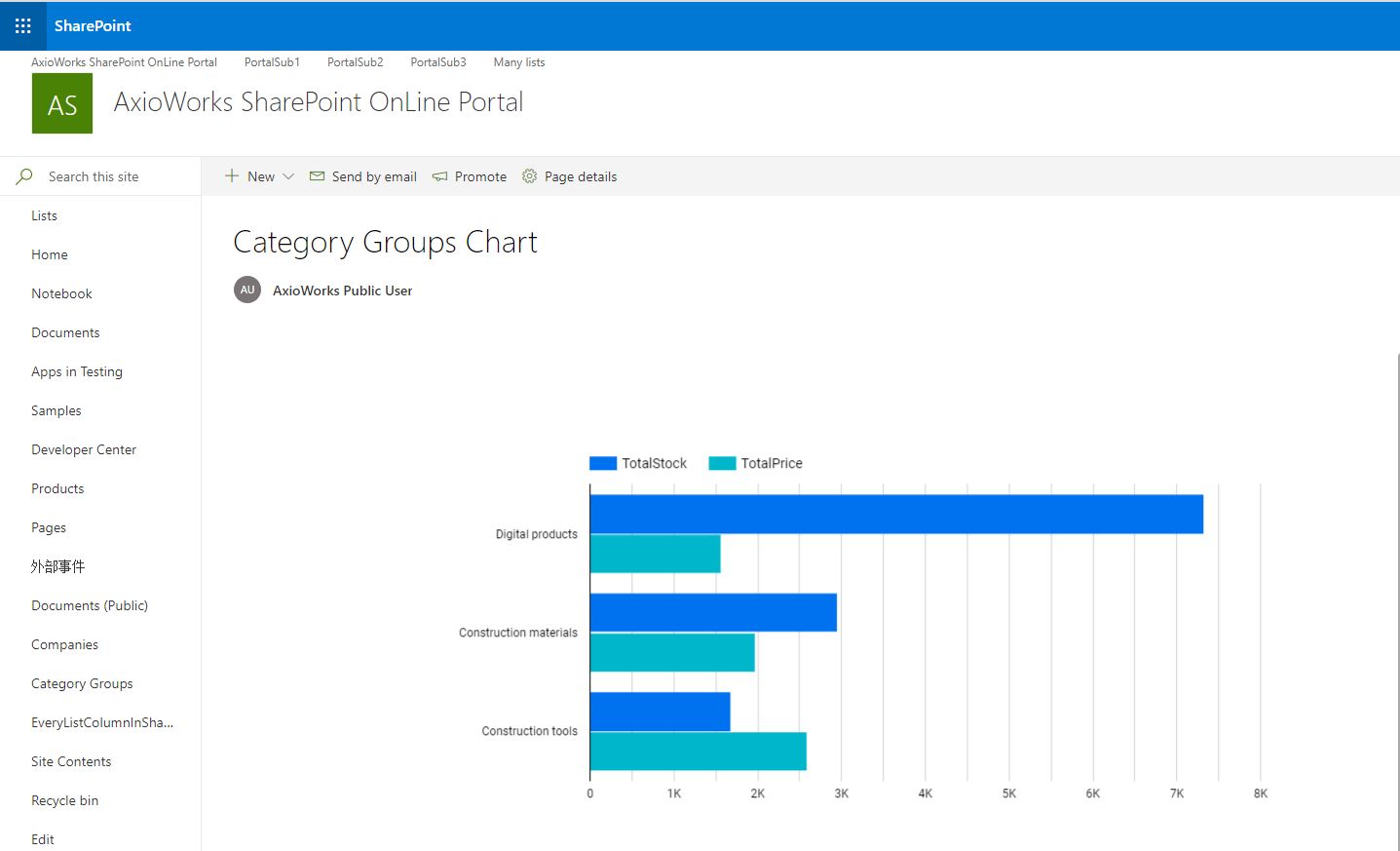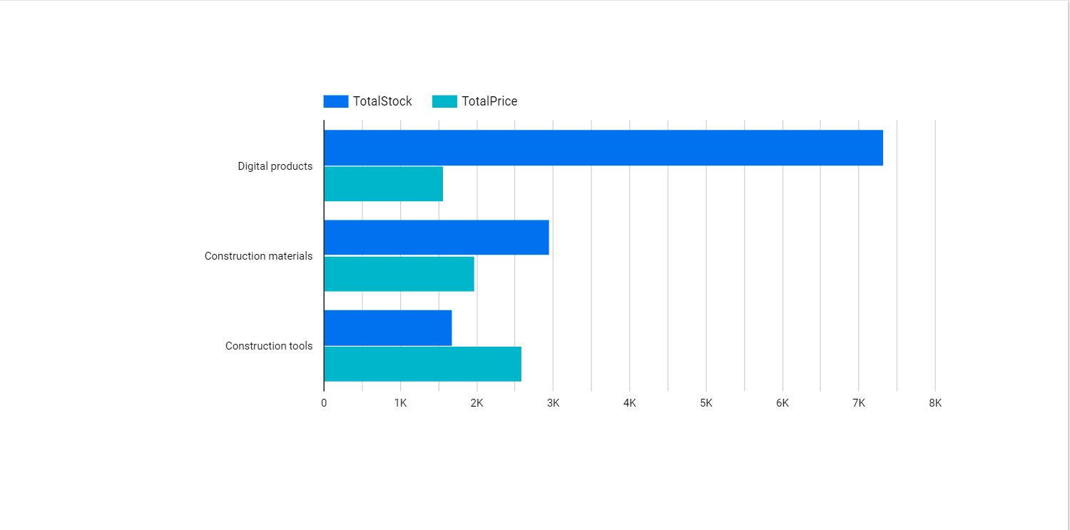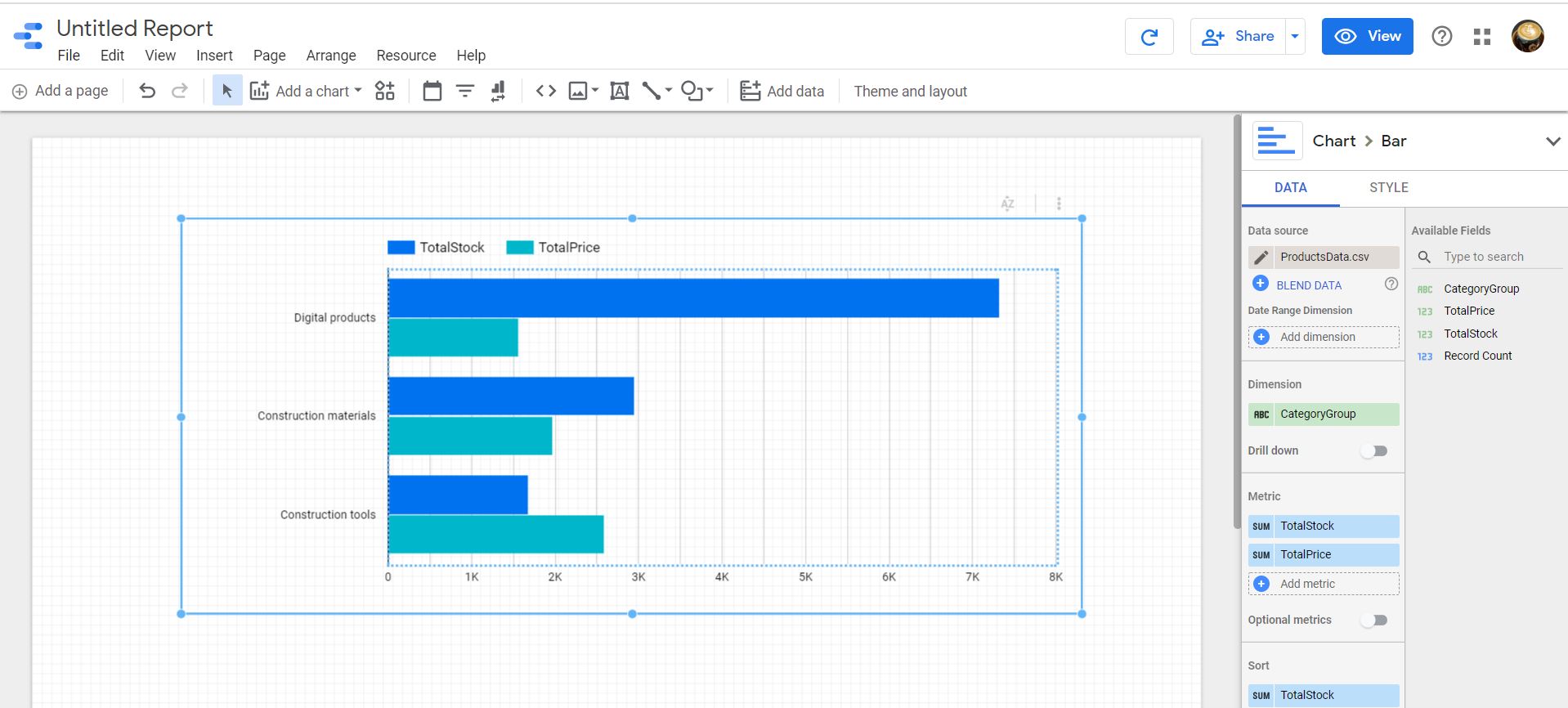 - Add CategoryGroup as the Dimension, and TotalPrice, TotalStock as Metrics of the chart