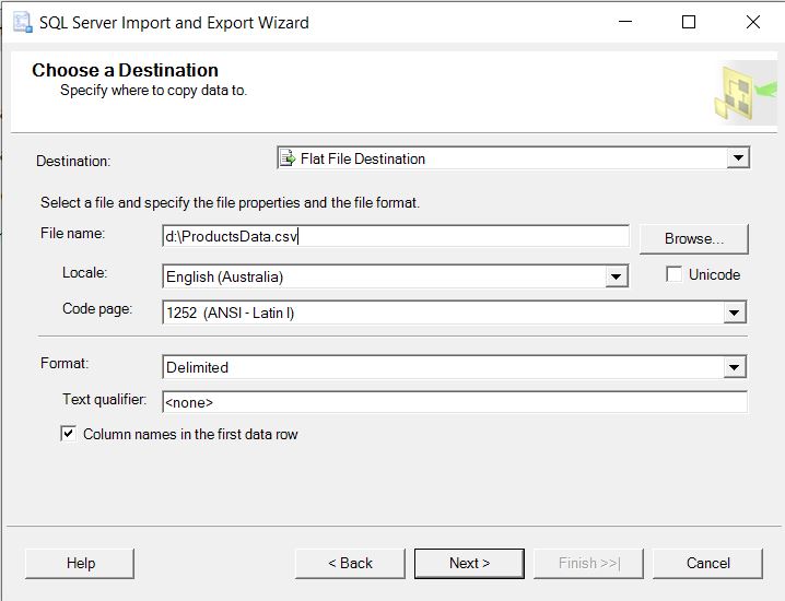 - Next, enter the details for the destination SQL database connection which is the database we created earlier.