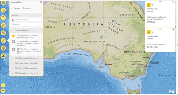 Let’s look at some cool features which make it stand out from the OOTB map visual. You can set different map themes from the map settings on the top left using Basemap. And you can also display additional info as well. For our example, Lets select the size of population and population of educated people.