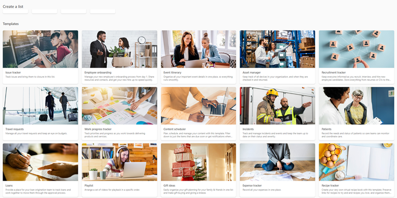 List templates provide a quick and easy starting point for setting up a new list and help you create lists using pre-configured layouts based on common scenarios that include columns, colour formatting, and data structure. Templates, both ready-made ones and your own custom templates, help in setting up a consistent information architecture being able to reuse templates to uniformly create a common set of columns, formatting, views, and rules, and saving you from having to always configure from scratch.