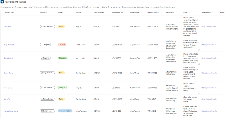 The Recruitment Tracker template within Microsoft Lists makes it easy to manage the process of hiring new recruits. It is designed to help everyone involved in the recruitment team be informed as you recruit, interview, and hire new employee candidates. Store everything from resumes or CVs to the progress on decisions, names, dates, and even comments from interviewers.