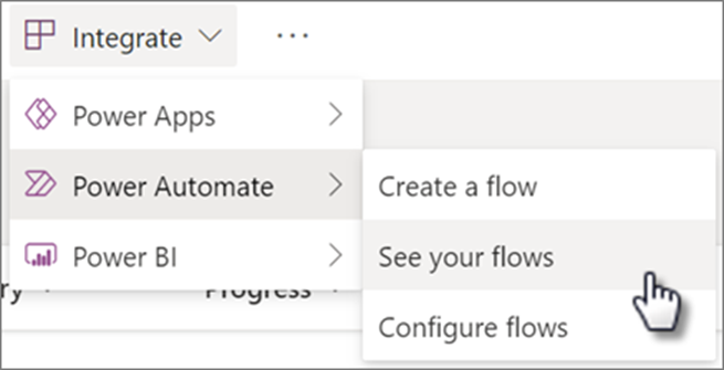 In the list that includes a flow, select Integrate, select Power Automate, and then select See your flows.