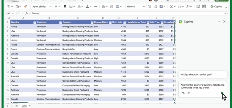 Copilot can give answers that usually require complex formulas and can show you different visualizations, and projections, and give recommendations without changing the spreadsheet. It can analyze trends based on your prompts and create professional-looking data visualizations.