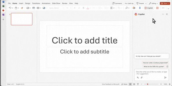 Copilot can use your natural language prompts or a Word document to create a beautiful presentation, adding relevant content from a document you made last week or last year. With simple commands, you can simplify longer presentations.