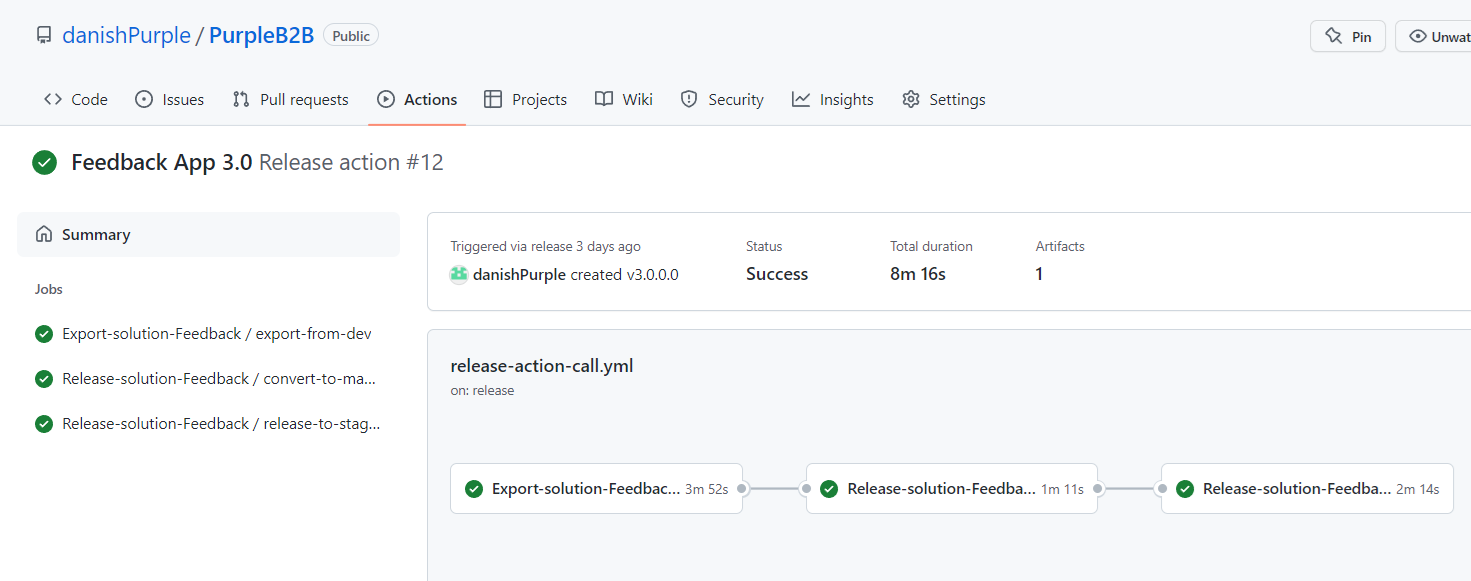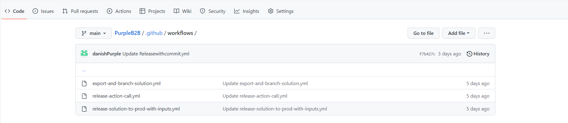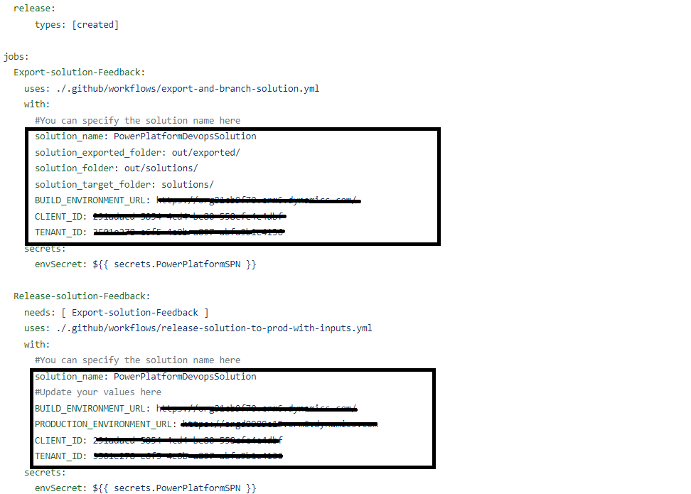 Now we will create the final flow using a similar approach and name it “release-action-call.yml and then copy the yml from here”. This flow will be triggered when a release is created and it will call the other two workflows to export the solution and then import it into the Test/Production environment. Update the parameter values with your environment URLs, solution name, and Azure App details.