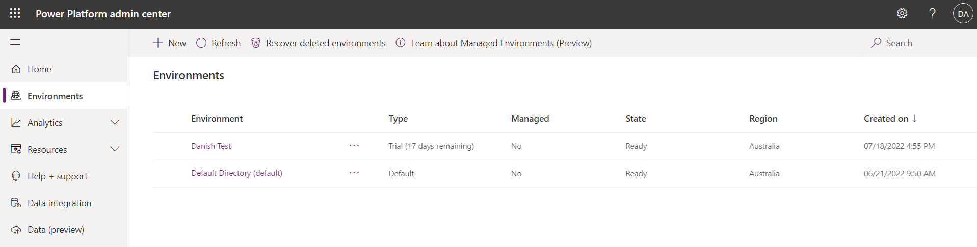 Lets start off by creating two environments one act as Development in which you will create or import a solution and the other act as your test/Production environment where you want to deploy the solution. Make sure both environments has Dataverse.