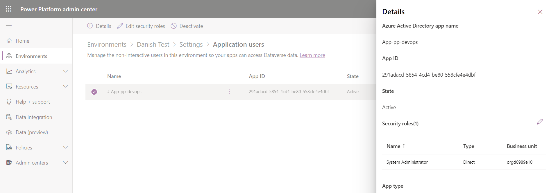 Add the Azure Service Principal in both environments as App User and grant it the System Administrator role.