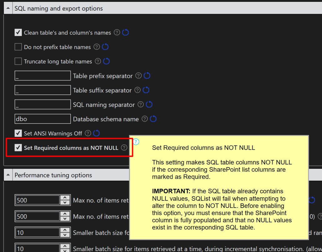A new setting has been introduced to export the required SharePoint column as NOT NULL in the corresponding SQL table. This means that SQL columns will be set as NOT NULL if the relevant SharePoint column is marked as “Required.”