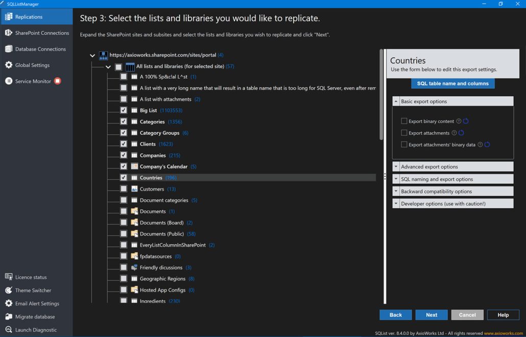 Configure the connection to the SharePoint site containing the lists youwant to export.